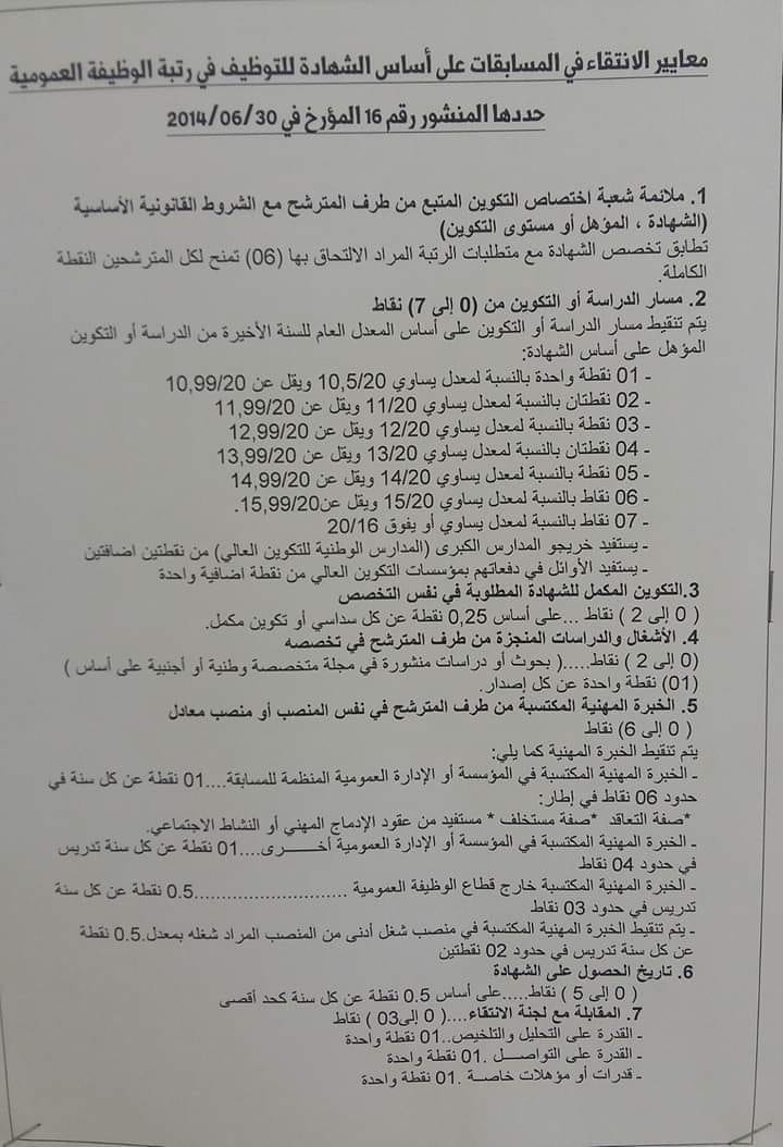 معايير الانتقاء في المسابقات على اساس الشهادة للتوظيف في رتبة الوظيفة العمومية منشور رقم 16 المؤرخ في 30 06 2014 رحاب الجزائر