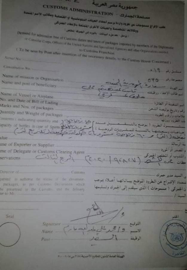 علي النسي على تويتر وثيقة رسمية من السفارة اليمنية بـ القاهرة موجهة الى مصلحة الجمارك المصرية لاعفاء الطرود الديبلوماسية الخاصة بالملحق العسكري اليمني بالسفارة في مصر العميد ثابت عبده هيثم من الجمارك والطرد