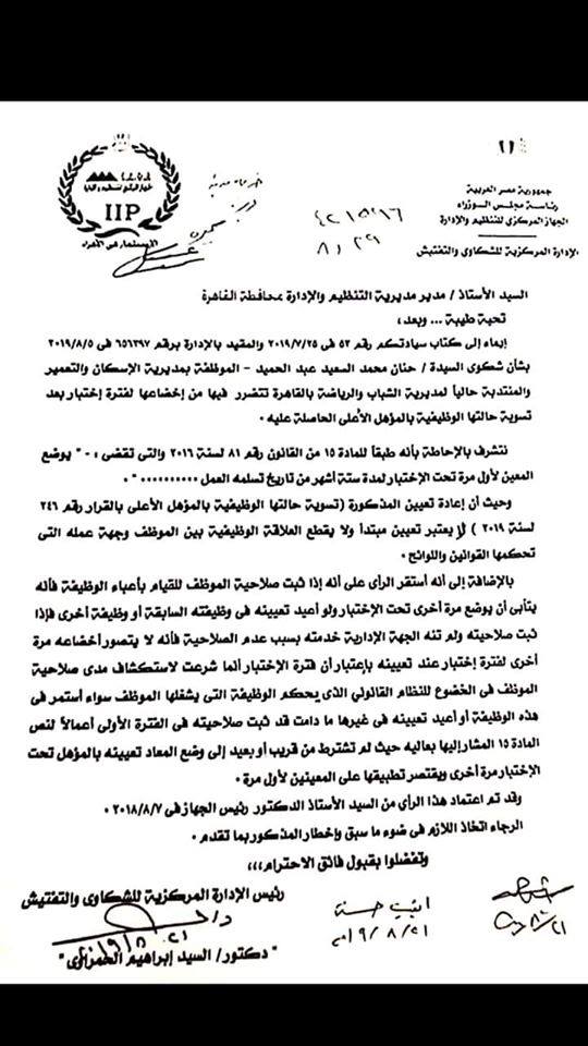 التنظيم والإدارة عدم خضوع المعاد تعيينه بالمؤهل الاعلى لفترة إختبار أنباء سوهاج