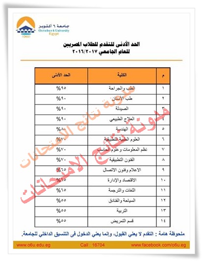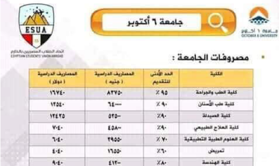 تنسيق القبول بكليات جامعة 6 أكتوبر الخاصه للعام الدراسى 2017 2018 ومصاريف الكليات بها