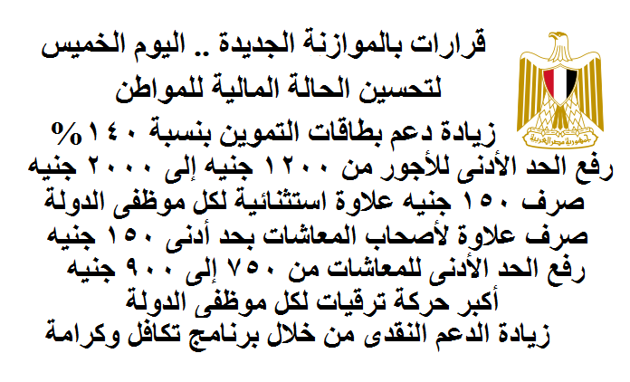 اليوم الخميس قرارات بالموازنة لتحسين الحالة المالية للمواطن خلال شهر يوليو الحالى 2019