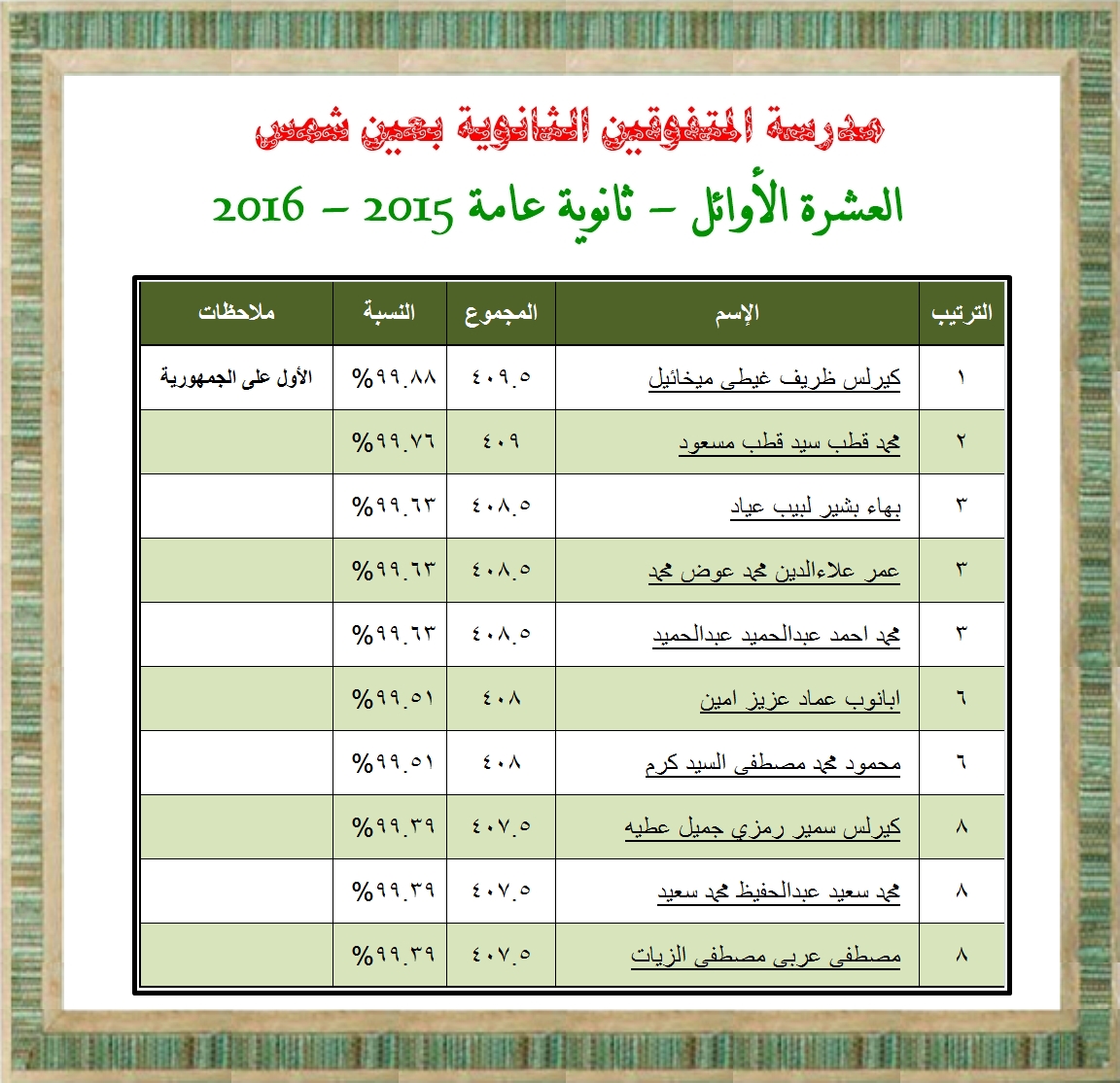 العشرة الأوائل ثانوية عامة 2015 2016 على مستوى مدرسة المتفوقين بعين شمس مدرسة المتفوقين الثانوية بعين شمس