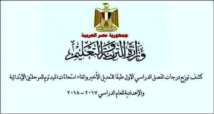 كشوف توزيع درجات الفصل الدراسي الاول بعد الغاء امتحانات الميدترم للمرحلتين الابتدائية والاعدادية للعام الدراسي 2017