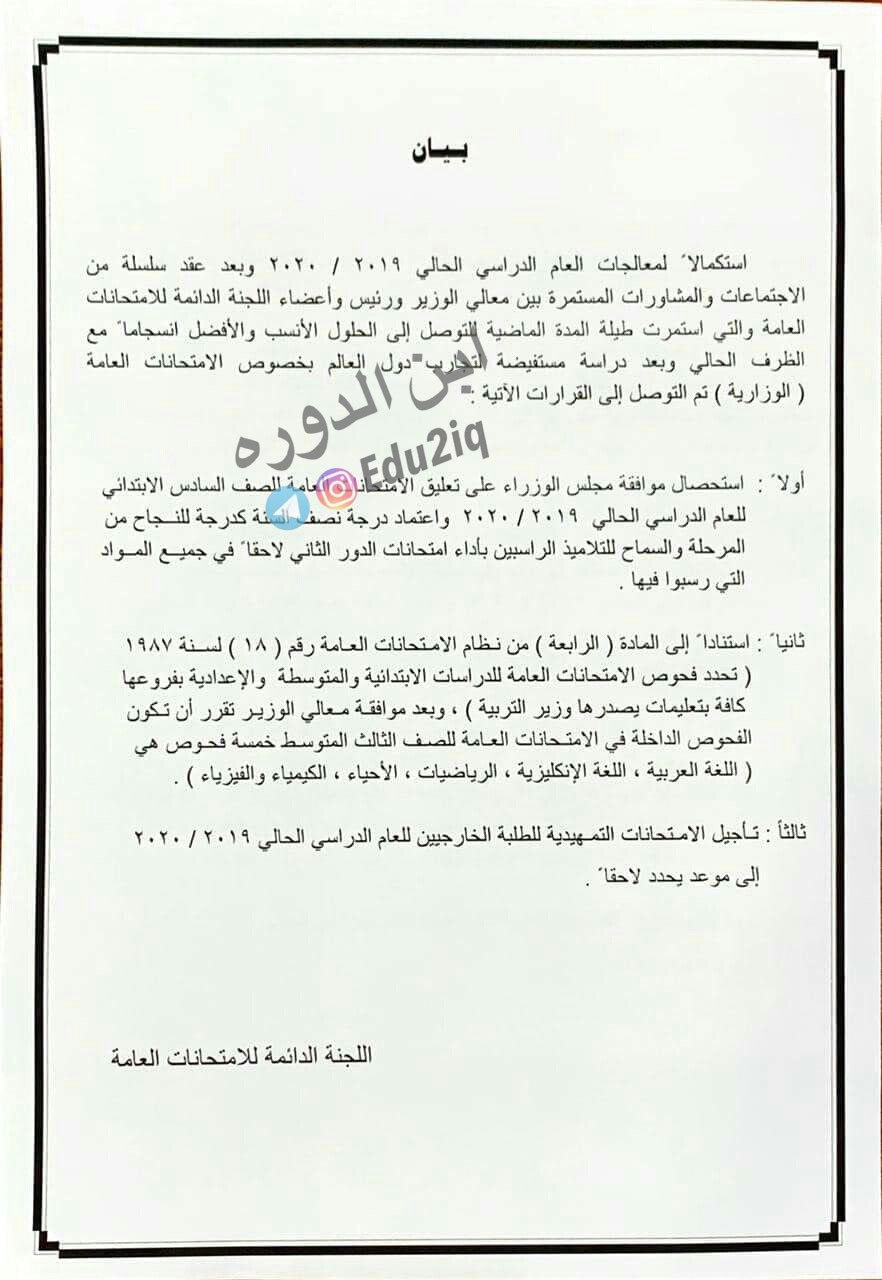 وزارة التربية تقرر إلغاء الامتحان الوزاري للسادس الابتدائي وتأجيل امتحان التمهيدي 2020 وتقليص مواد الثالث Ben Larsa Karrar Net موقع