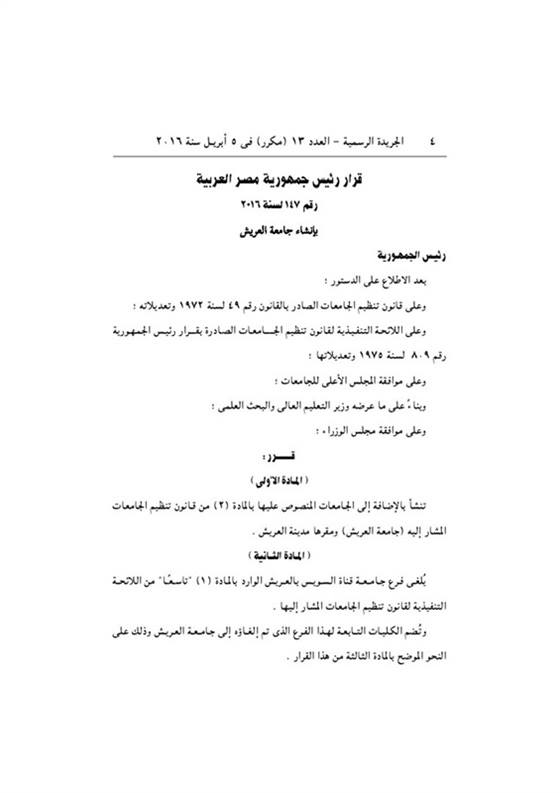 قرار جمهوري رقم 147 لسنة 2016 بإنشاء جامعة العريش