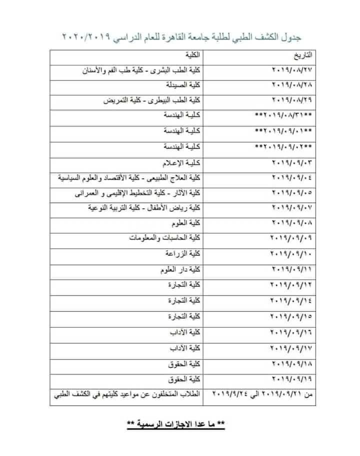جدول الكشف الطبي لطلبة جامعة القاهرة