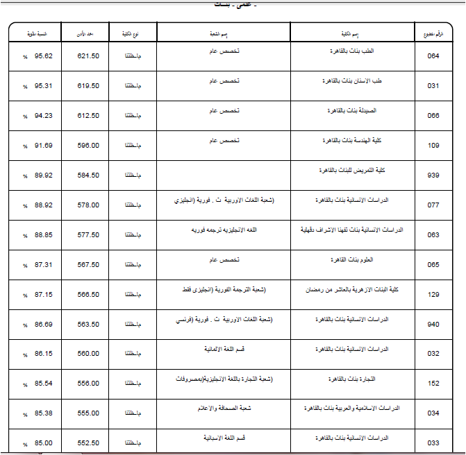 الكليات المتاحة للمرحلة الثانية 2016 علمى علوم وأدبى وعلمى رياضة