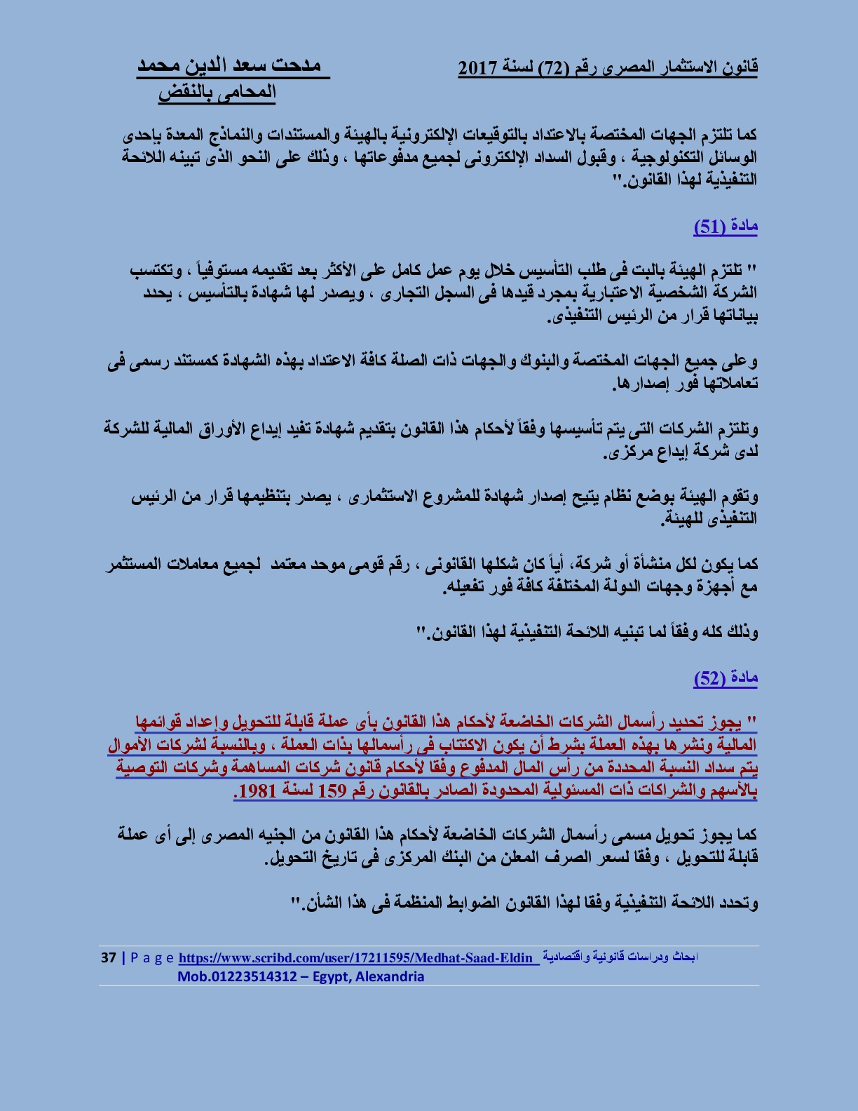 مدحت سعد الدين محمد المحامى بالنقض قانون الاستثمار المصرى رقم 72 لسنة 2017