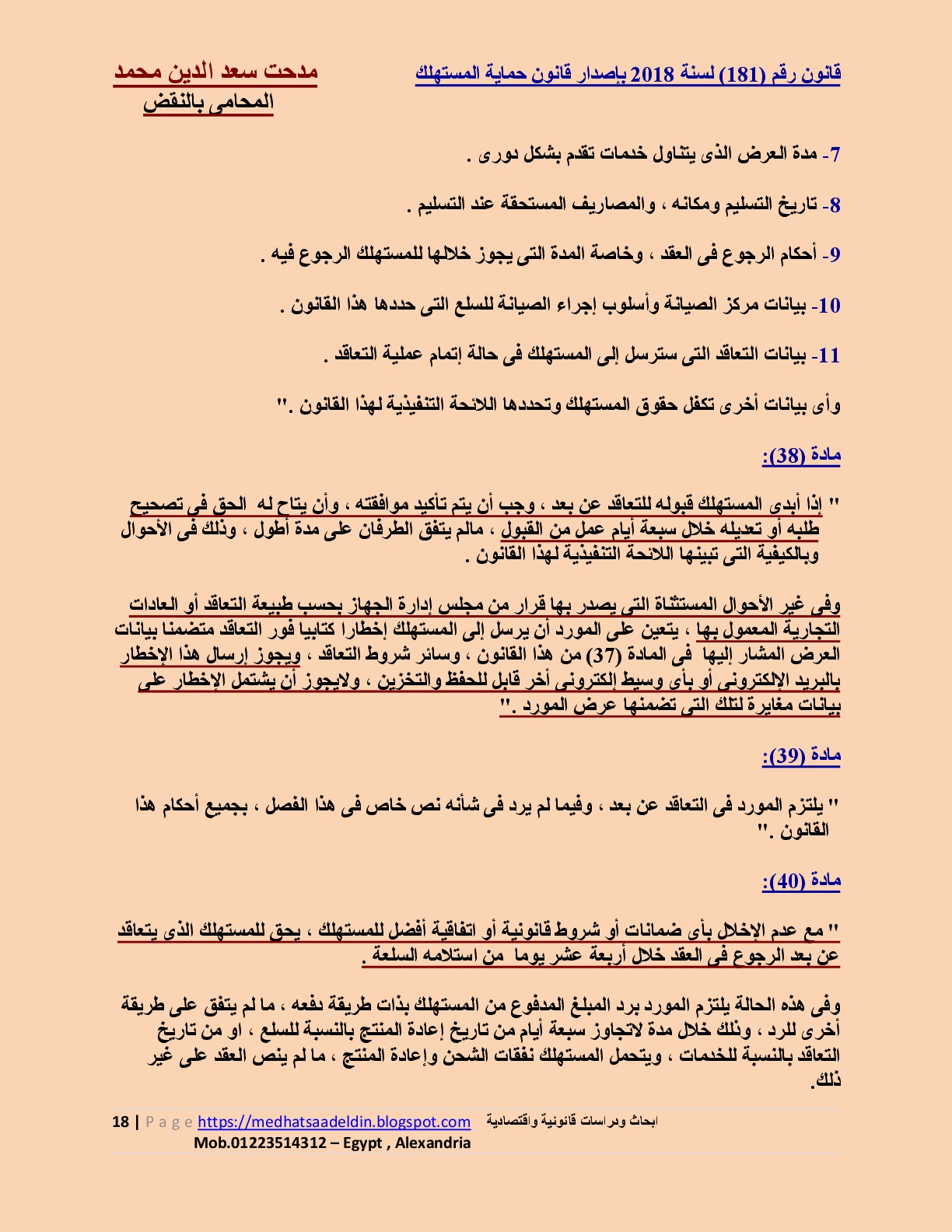 مدحت سعد الدين محمد المحامى بالنقض قانون رقم 181 لسنة 2018 بإصدار قانون حماية المستهلك المصرى