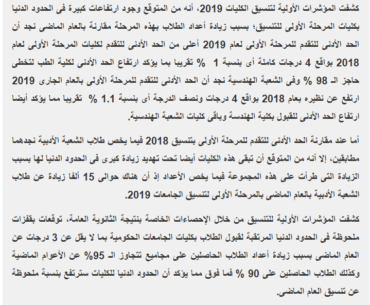 المؤشرات الأولية للمرحلة الأولي في تنسيق الثانوية العامة 2019 تنسيق كلية الطب يصل إلى 98 5 وكلية الصيدلية 97 8 وباقي الكليات من هنا كلمة دوت أورج