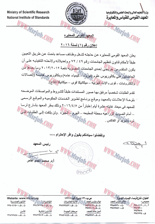 وظائف حكومية بتاريخ 11 ابريل 2016 المعهد القومى للقياس والمعايرة