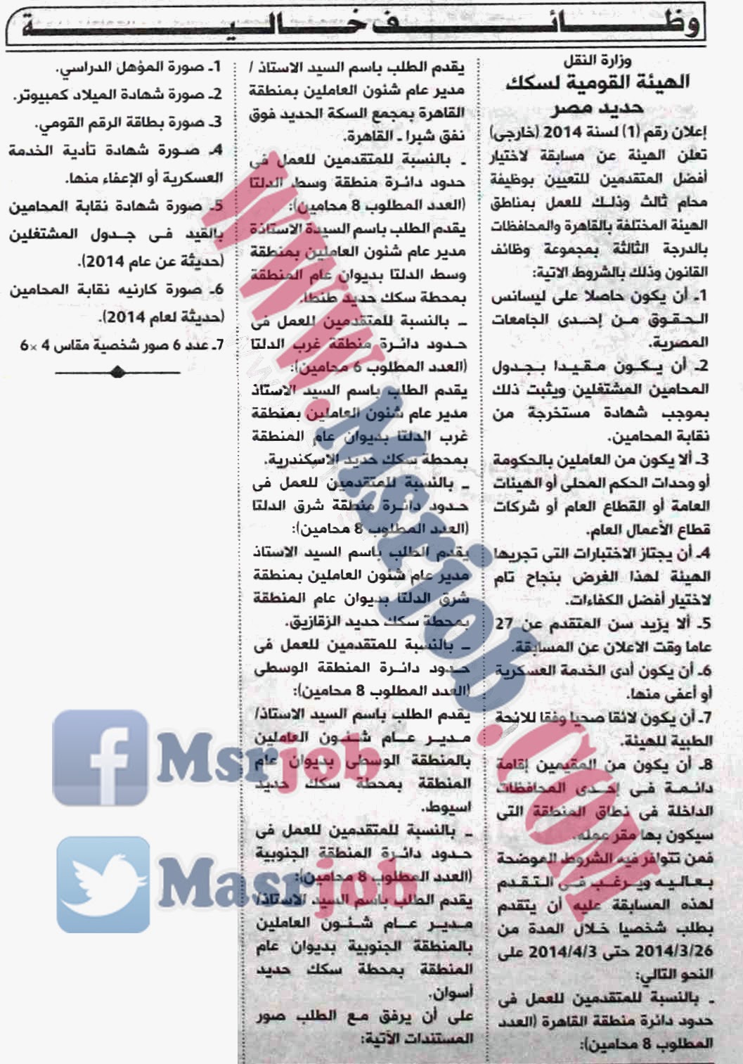 وظائف الهيئة القومية لسكك حديد مصر اعلان رقم 1 لسنة 2014