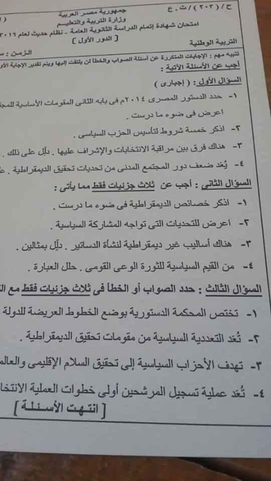 نموذج إجابة امتحان التربية الوطنية للثانوية العامة 2016