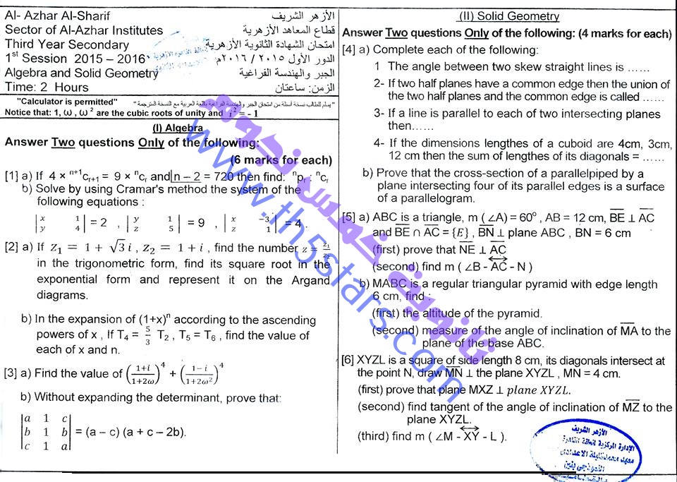 ورقة امتحان الجبر والفراغية 2015 ثالثة ثانوى ازهر الاجابات