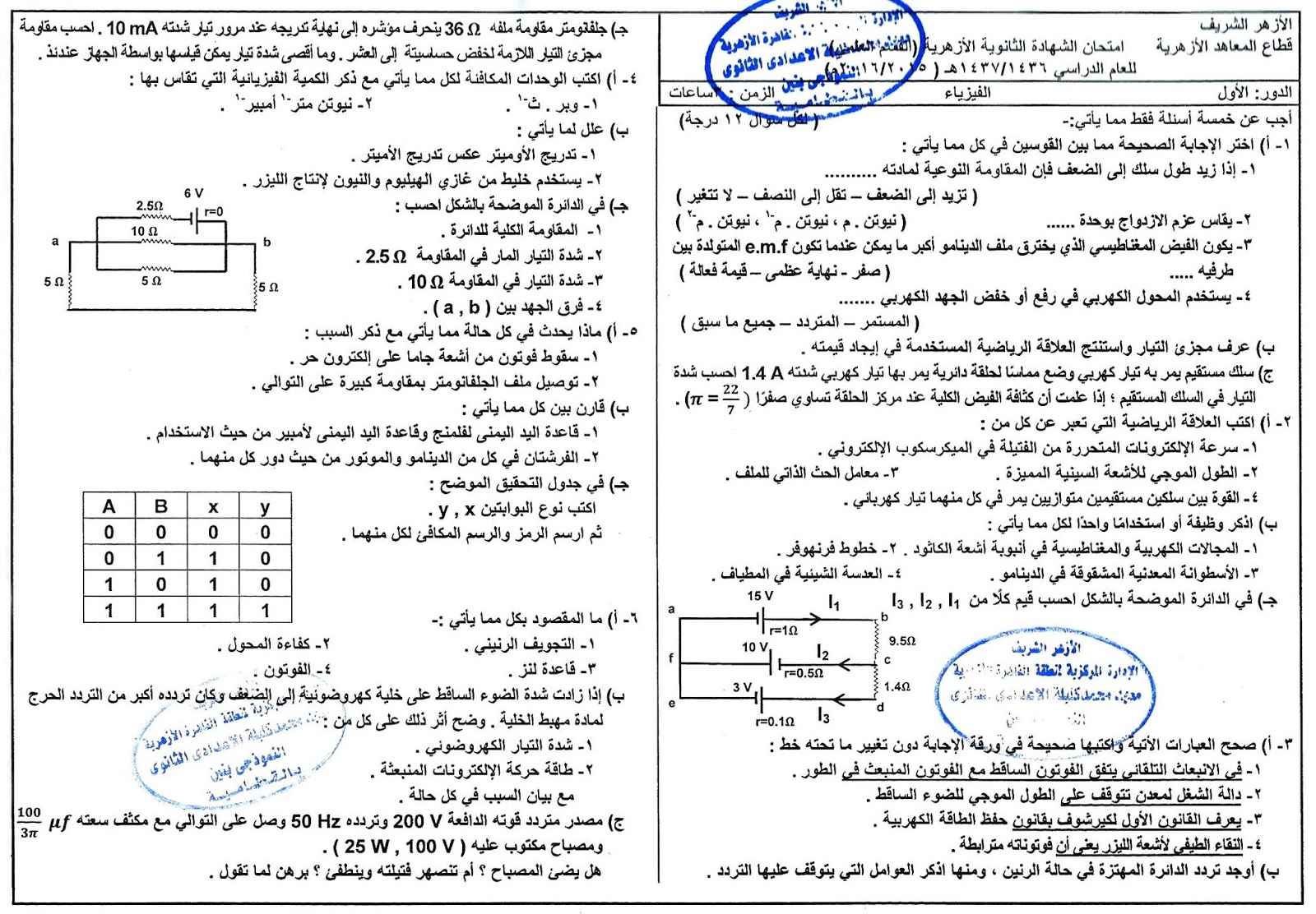 مذكرات مراجعات امتحانات مرحلة ثانوية اعدادية ابتدائية ازهر امتحان الازهر الفيزياء للثانوية العامة 2016