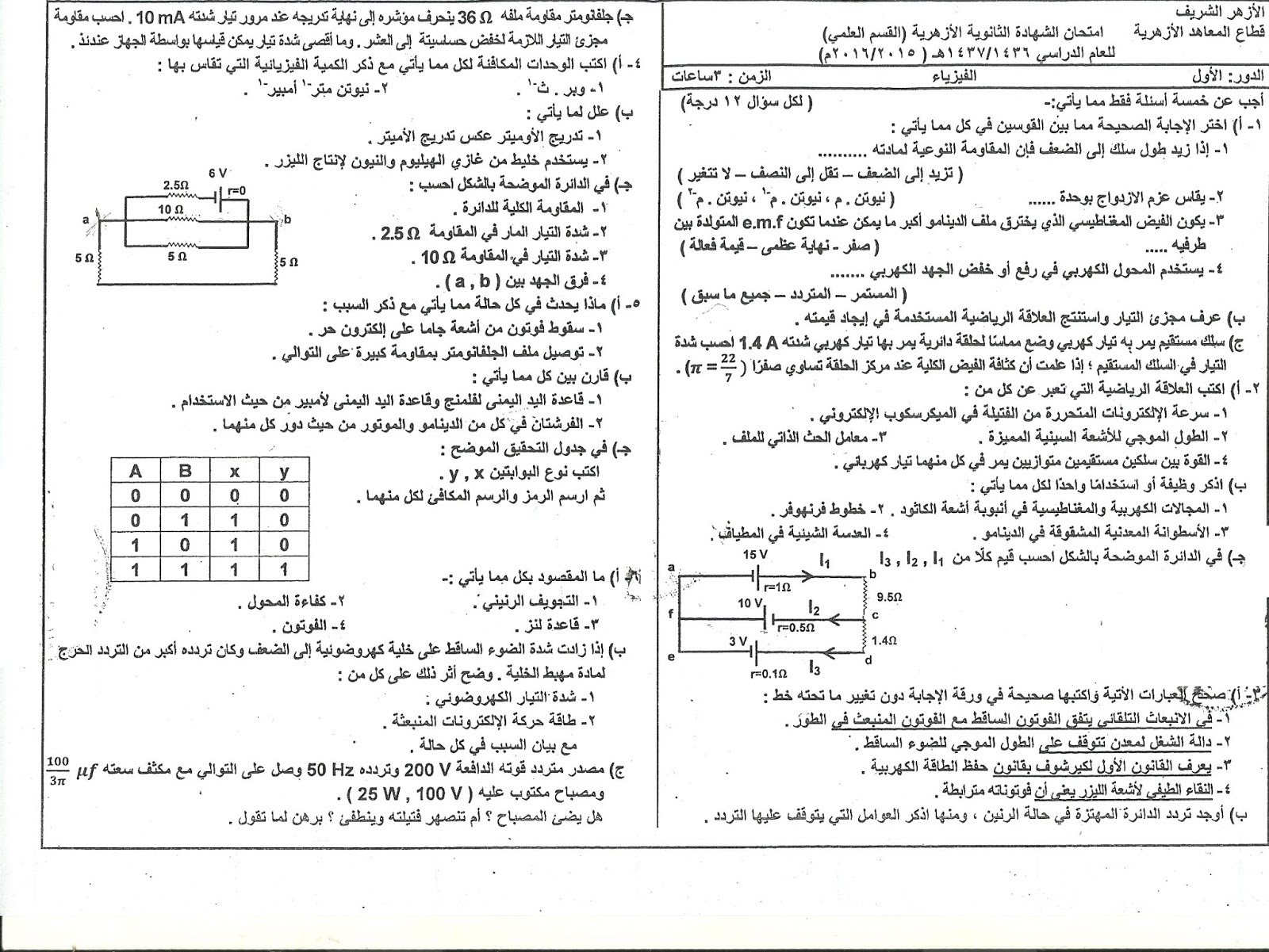 الفيزياء للثانوية العامة امتحان الازهر فى الفيزياء للصف الثالث الثانوى 2016