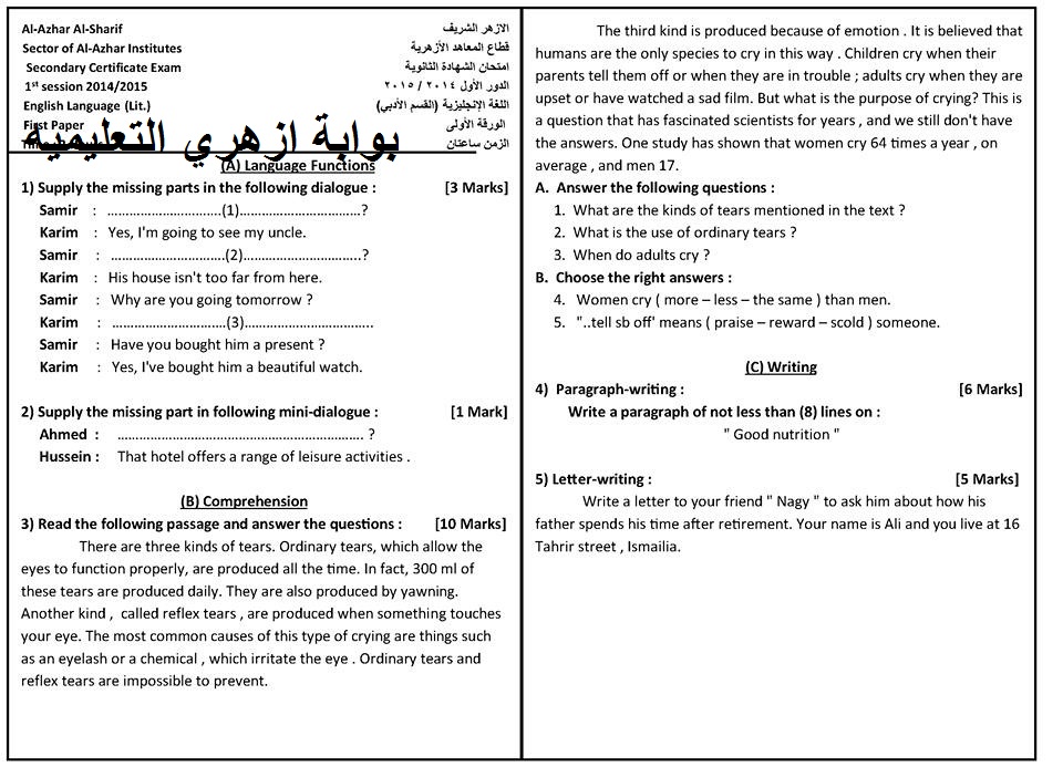امتحان اللغة الانجليزية للثانوية الازهرية 2016