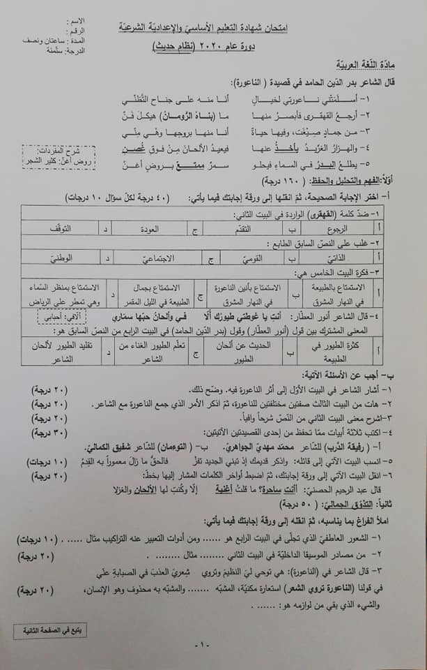 اسئلة العربي تاسع 2020 مع الحل ورقة اسئلة امتحان مادة اللغة العربية تاسع 2020