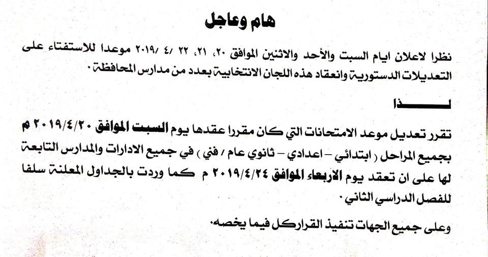 بعد اعلان موعد الأستفتاء تعديل موعد الأمتحانات 2019 المتعارضة مع جدول الأستفتاء ننشر التفاصيل